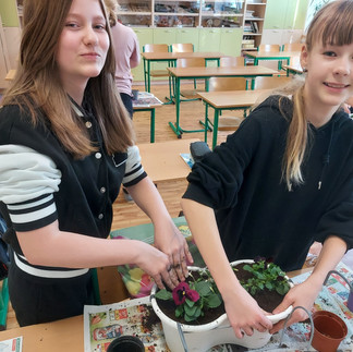 Děvčata z 6. třídy se v hodině PČ postarala o novou výzdobu vstupu do školy. Staré truhlíky z konce podzimu už dosloužily a bylo potřeba je vyměnit za nové – jarní.
