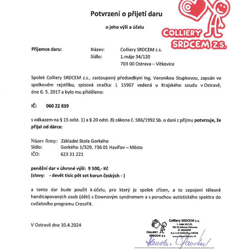 Při této příležitosti jsme tedy také zorganizovali sbírku. Její výtěžek je 9 500,- Kč! Tuto částku pošleme na konto neziskové organizace Colliery Srdcem, která se věnuje sportovním aktivitám pro tělesně i duševně postižené, mladé atlety a seniory.